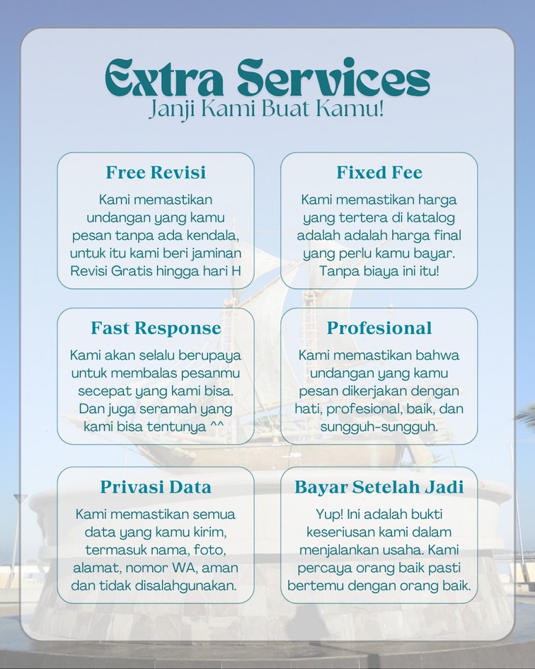 Kami ingin memastikan undanganmu dibagikan sempurna tanpa kendala. Untuk itu kami menyediakan berbagai fitur hingga service yang membuat undanganmu semakin berkesan.