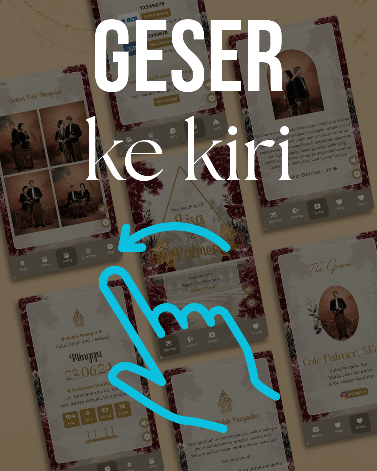 Swipe ke kiri untuk melihat preview semua fitur pada setiap halaman undangan digital.